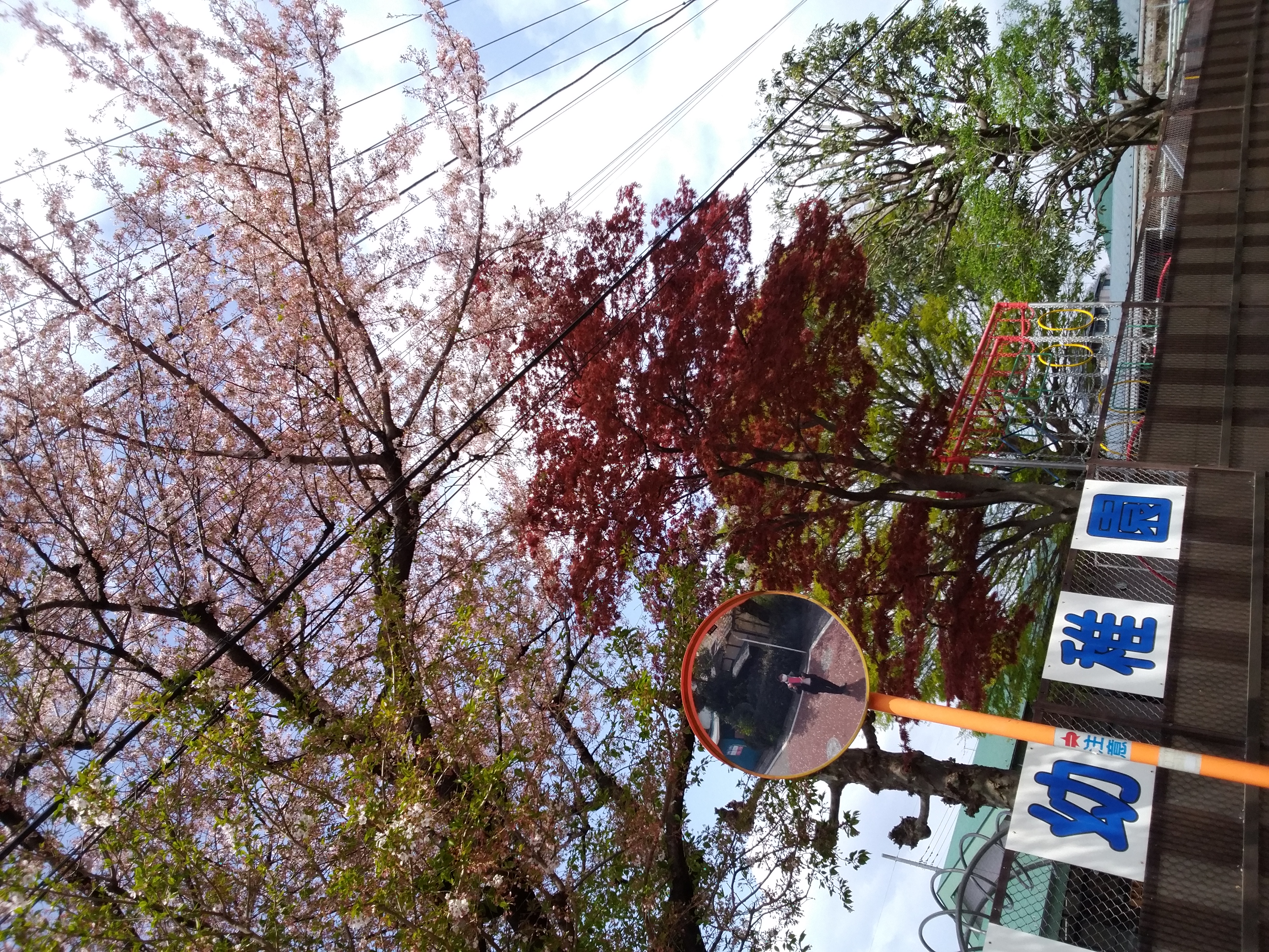 勤務している幼稚園にて昼食時間となり、今週で見納めになる桜🌸と隣の紅葉🍁を眺め、歌唱レッスンにて題材となった歌を歌いながらカレーライス🍚を食べています。