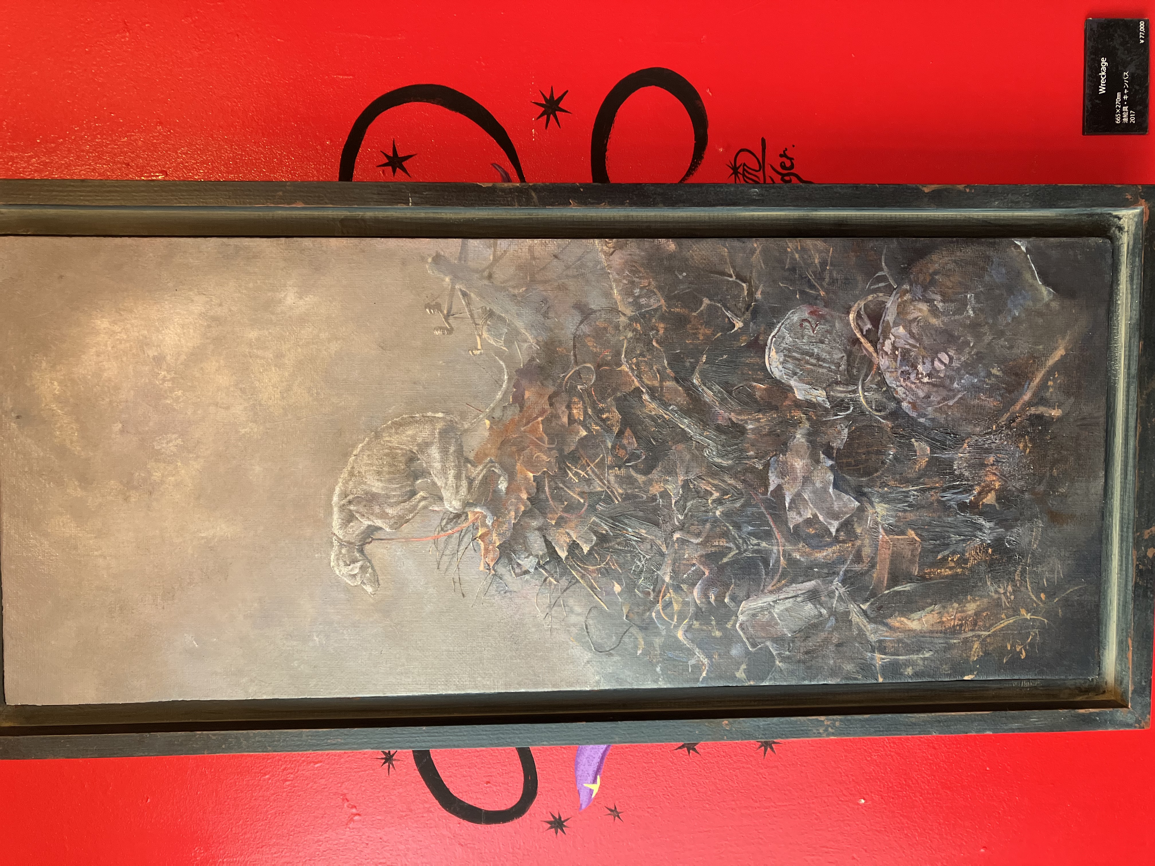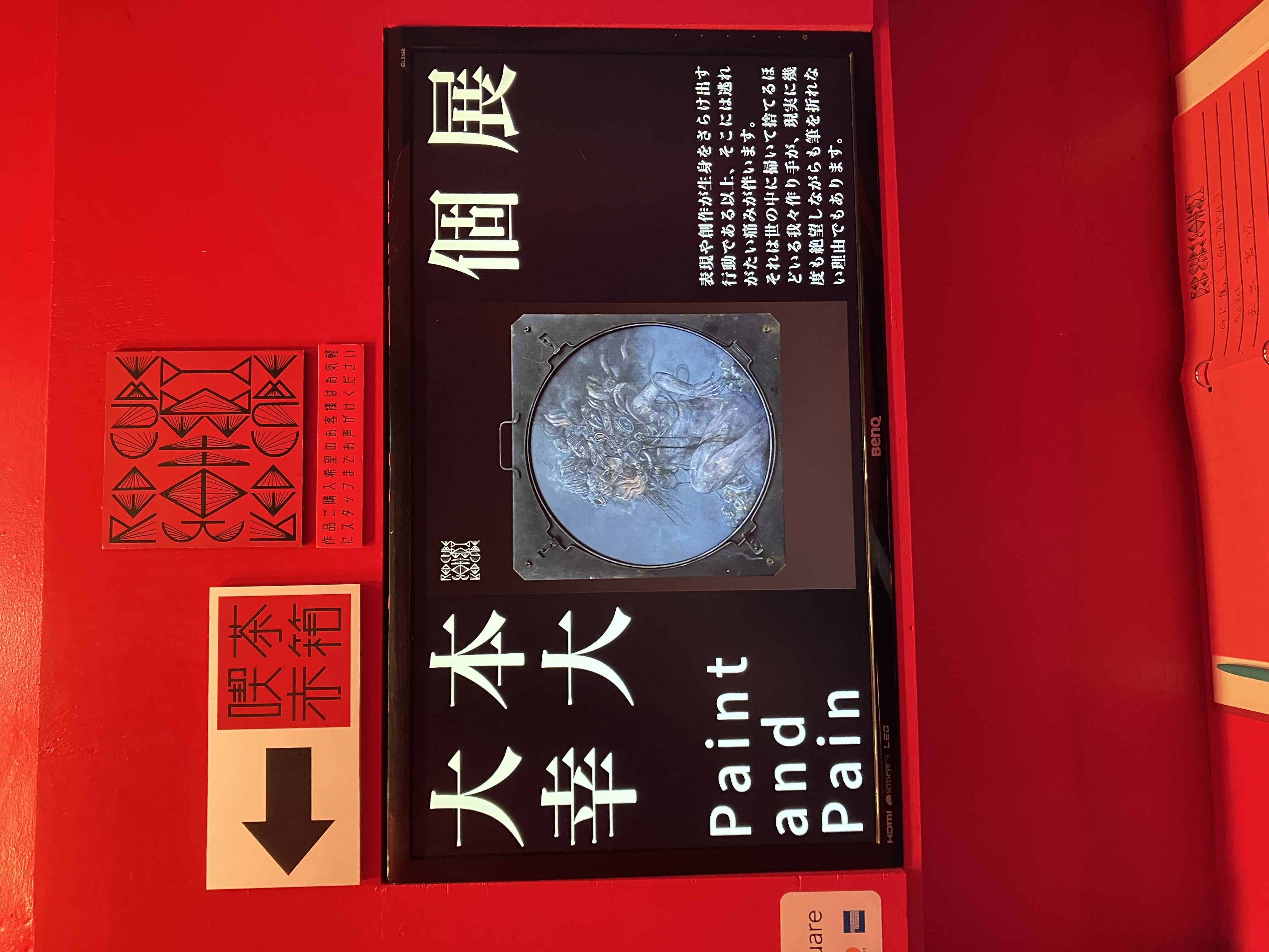 そんな真っ赤な空間に全然負けない凄いインパクトある作風の大本君の作品。私の家には似合わないけれど、好きな人は絶対好きだろうし、作品に添えられている詩もとてもメッセージ性のあるものなので、訪ねて損はしないはず。