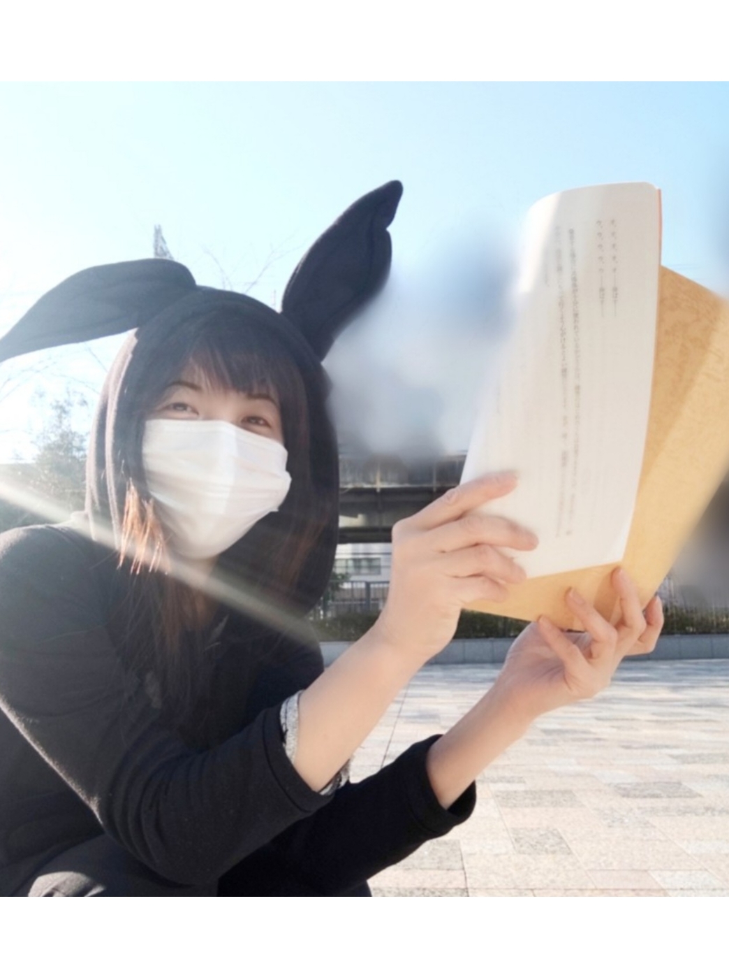 風はやや強く、うさぎの耳付きパーカーのフードをかぶって発声練習です。